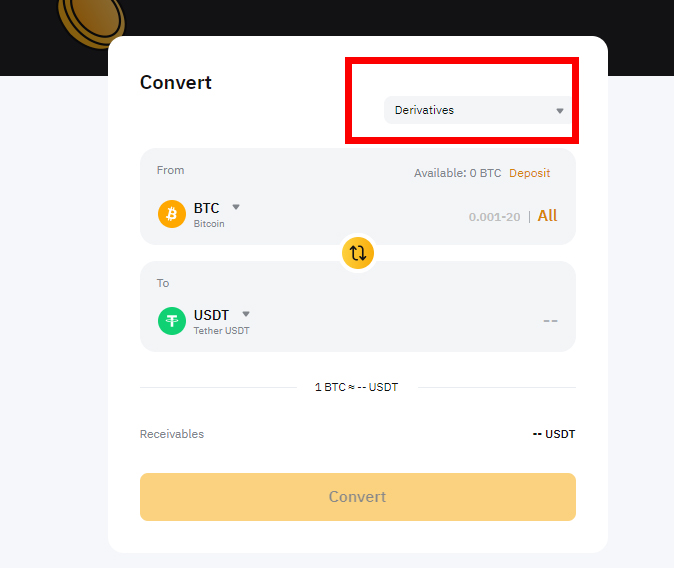 우측 상단에 Derivatives 지갑 선택 후 From에 코인 선택 및 수량, 그리고 To를 USDT로 선택하고 Convert를 클릭하면 됩니다.