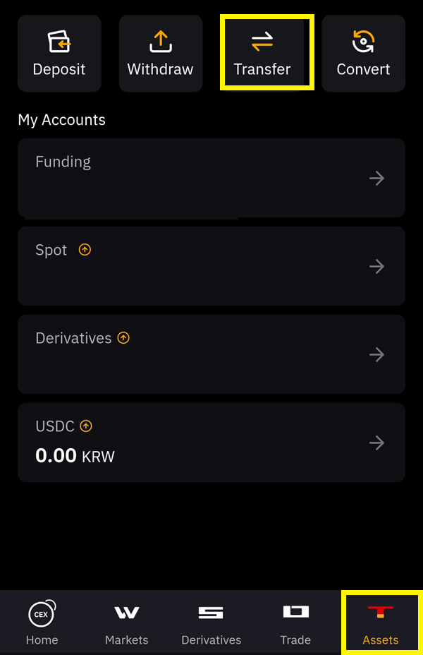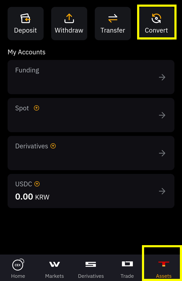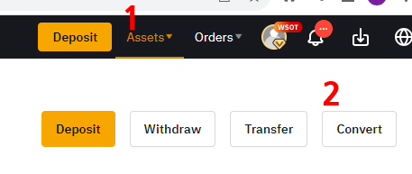 국내 거래소에서 해외 거래소 입금은 usdt로 불가하기에 입금 된 코인을 테더로 교환해야합니다. 홈페이지 메인에서 Assets 클릭 후 Convert를 클릭하세요.