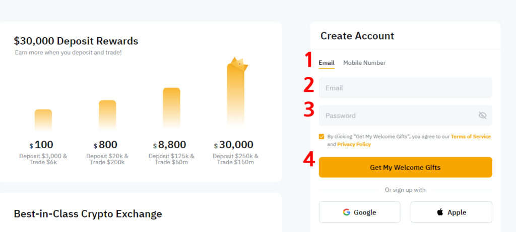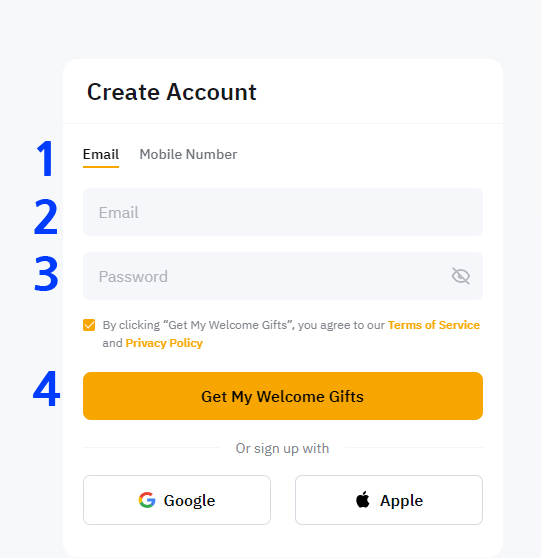 링크 클릭 후 나오는 화면에서 휴대폰 번호 가입은 Mobile Number 선택, 이메일 가입은 Email 선택 후 정보를 입력하세요. 패스워드는 숫자, 소문자, 대문자 1개씩 필수로 들어가야 하며 8~30자리 글자로 입력하세요.