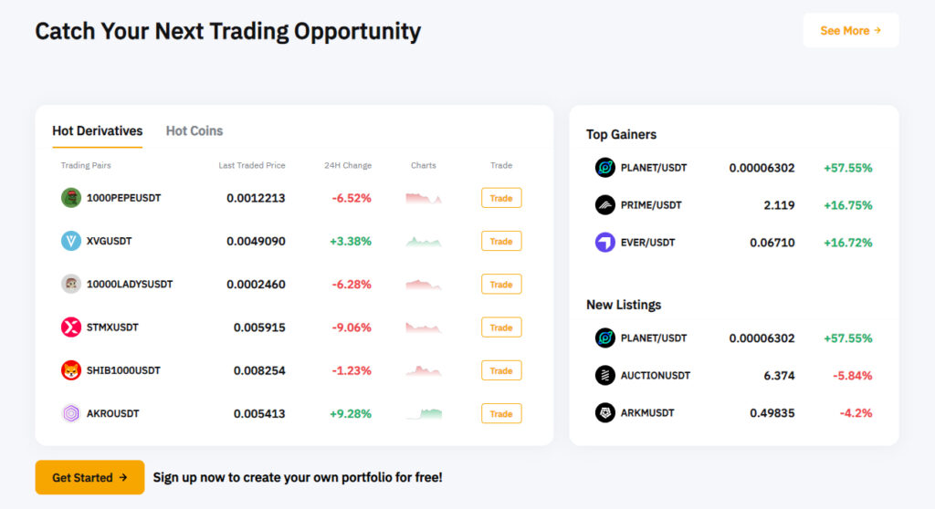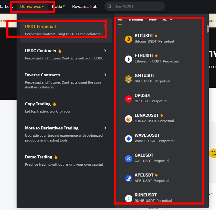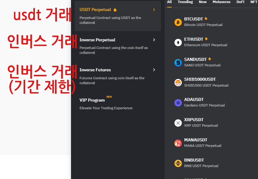 선물거래 종목은 홈페이지 메인에서 Derivatives – USDT Perpetual 클릭하면 나오는 코인 중 선물거래를 원하는 종목을 선택하면 됩니다.