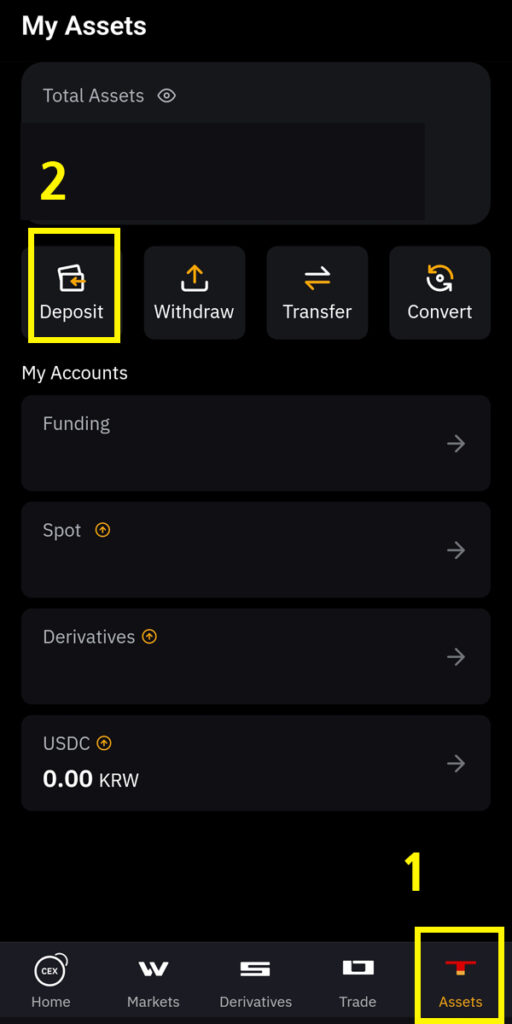 바이비트 선물거래 앱에서 Assets 클릭 후 Deposit 클릭