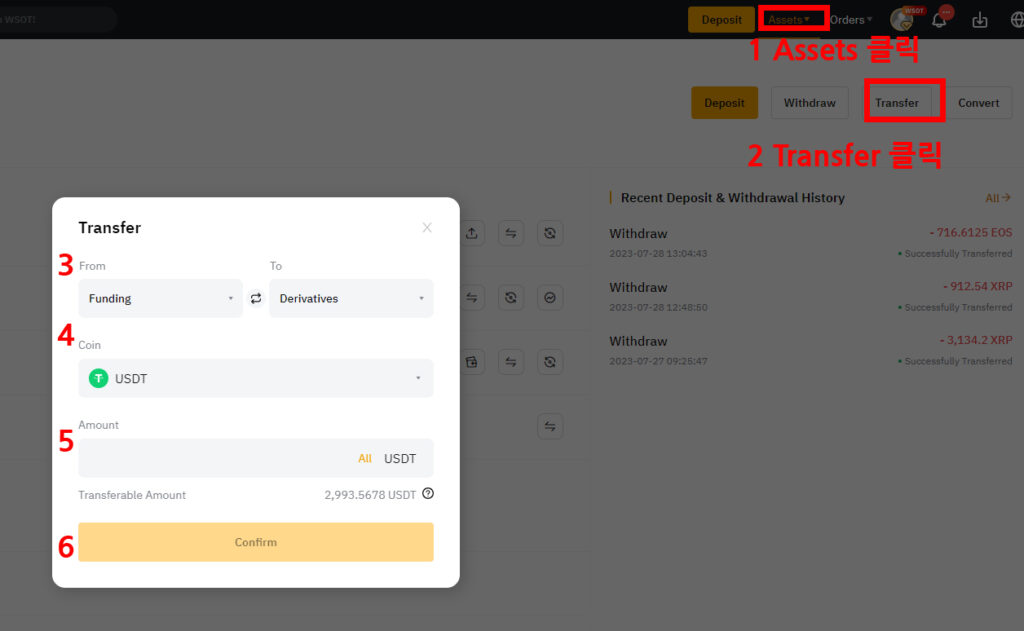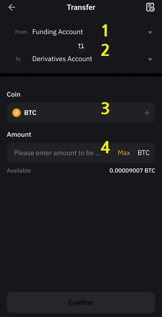 From을 코인을 보유한 지갑 선택, To를 Derivatives Account 설정 후 원하는 코인 선택 후 수량 입력 그리고 Confirm 버튼을 클릭하세요.