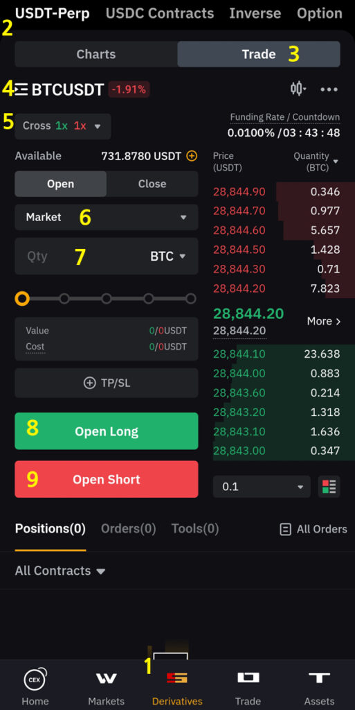 먼저 1번 Derivatives 선택 후 2번 USDT-Perp 선택, 그리고 3번 Trade를 선택하세요.
