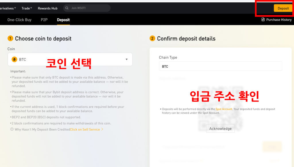 바이비트 입금 주소를 알아야합니다. 주소는 홈페이지 상단에 있는 Deposit 클릭 후 주소를 알고 싶은 코인을 선택하세요. 그러면 오른쪽에 주소 확인이 가능합니다. 안 보일 경우 Acknowledge를 클릭하세요.