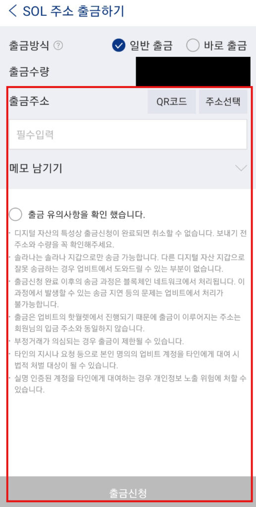 그러면 바로 qr 코드와 지갑주소가 나옵니다. 지갑 주소를 복사해서 업비트 출금 주소에 옮기면 끝