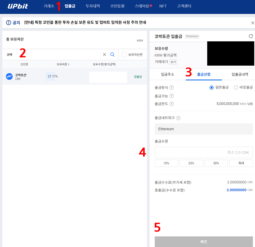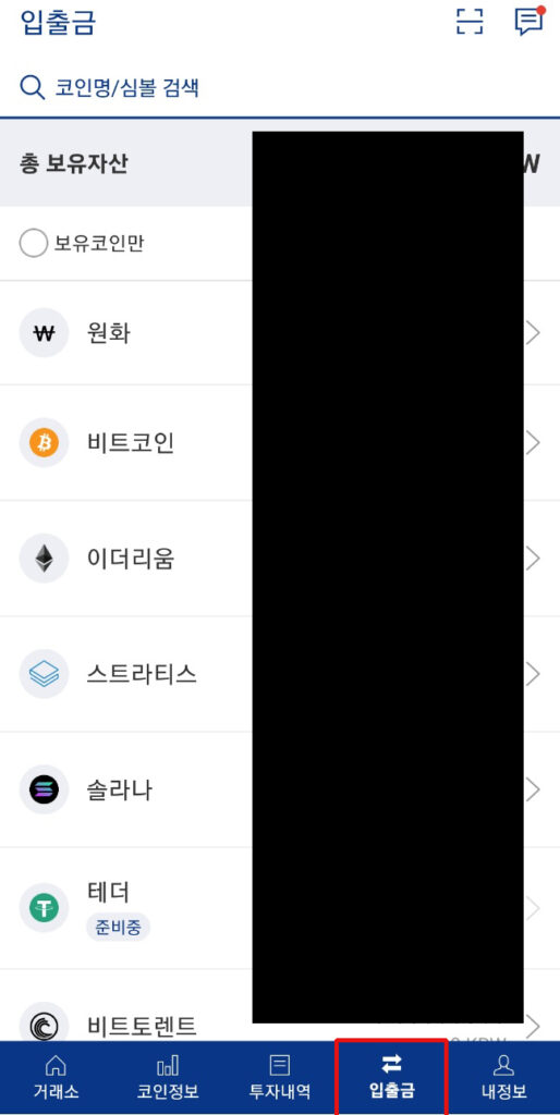 먼저 업비트에 로그인하고 입출금을 클릭합니다.