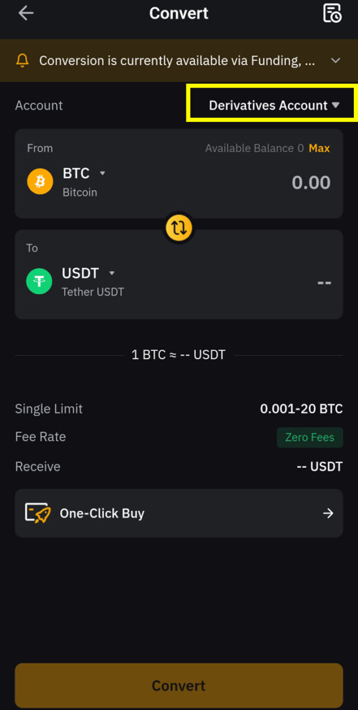 Account에서 Derivatves Account를 선택하고 From 에 내가 보유한 코인 선택 To를 USDT로 선택하세요.