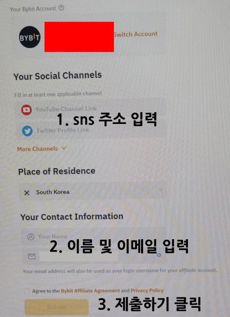 생각보다 쉽죠? 바이비트는 쉽게 레퍼럴 활동 자격을 주지 않습니다. 알차게 내용 적어주세요! 모든 정보를 입력하면 보통 24시간 안에 메일이 오고 보통 하루 내외로 승인이 납니다. 혹시 승인이 안난다면 포스팅에 있는 연락처로 카톡이나 연락주세요. 도와드릴게요.^^