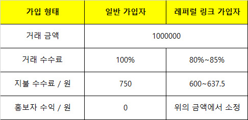 예를 들어 100만원 거래시 일반 가입자는 750원 수수료를 지불하지만 할인 링크 가입자는 600~637.5원 정도 지불되기에 거래자 입장에서는 반드시 링크를 받고 가입하는게 이익이며, 홍보자는 이 금액에서 일부 금액을 받게 됩니다.