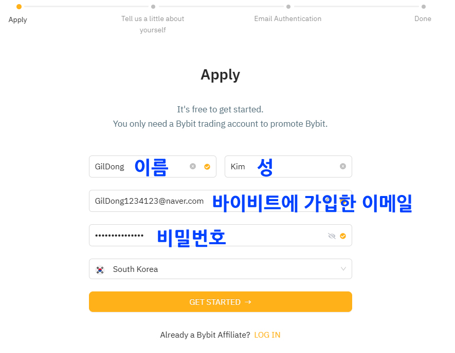 먼저 성, 이름, 바이비트에 가입한 본인 계정, 비밀번호를 입력하세요. 아래는 예시로 입력했습니다.