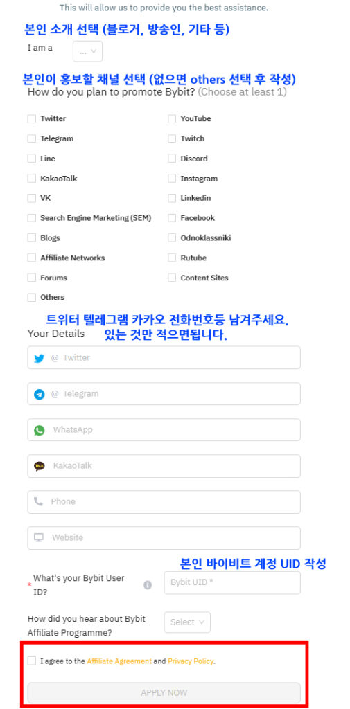 생각보다 쉽죠? 바이비트는 쉽게 레퍼럴 활동 자격을 주지 않습니다. 알차게 내용 적어주세요! 모든 정보를 입력하면 보통 24시간 안에 메일이 오고 보통 하루 내외로 승인이 납니다. 혹시 승인이 안난다면 포스팅에 있는 연락처로 카톡이나 연락주세요. 도와드릴게요.^^